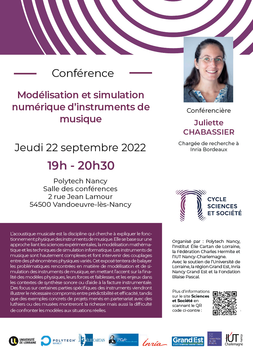 Pour cette nouvelle rentrée, Sciences et Société aura le plaisir d'accueillir Juliette Chabassier, chargée de recherche à Inria Bordeaux. Sa conférence s'intitule : Modélisation et simulation numérique d'instruments de musique. Elle aura lieu jeudi 22 septembre 2022 à 19h dans la salle des conférences de Polytech Nancy au 4ème étage.