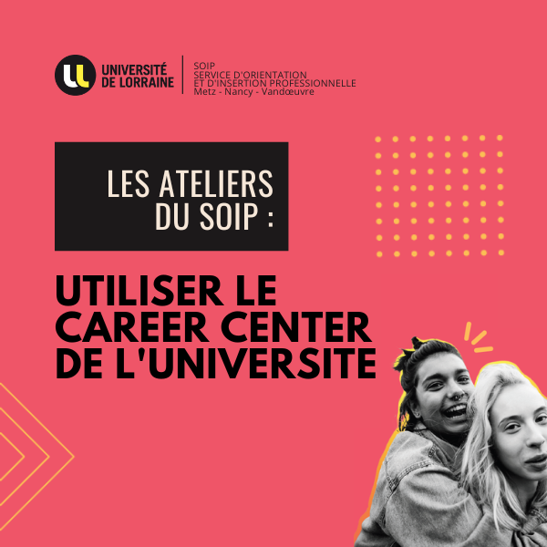 Le Career Center est la plateforme de l'université de Lorraine dédiée à l'insertion professionnelle de ses étudiants et l'objectif de cet atelier est d'en explorer les fonctionnalités et de s'initier à son fonctionnement. Au programme :