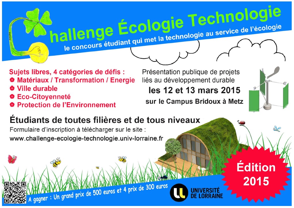 Les inscriptions sont ouvertes jusqu’au 28 février 2015 sur le site http://challenge-ecologie-technologie.blog.univ-lorraine.fr/