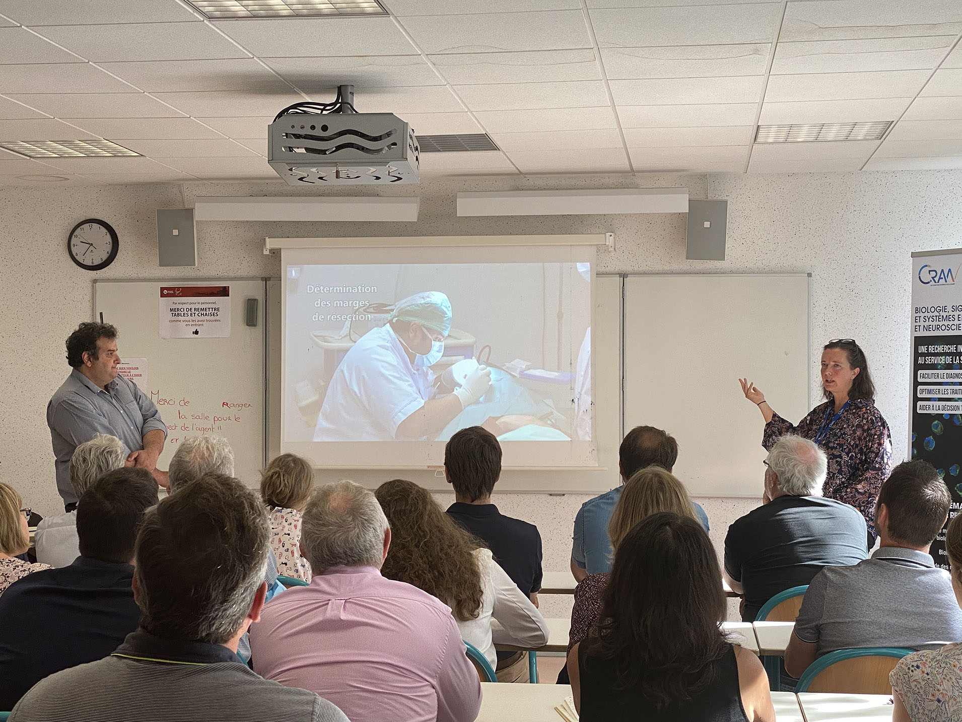 Après les prises de parole institutionnelles, Marine Amouroux, responsable scientifique de la plateforme, a présenté les fondements scientifiques de la PhotoVivo. Cette plateforme est unique par son caractère translationnel qui lui permet de transférer les innovations qu’elle développe « de la paillasse au lit du patient » avec 3 essais cliniques à son actif. À cette occasion, Grégoire Khairallah, chirurgien plasticien au CHR Metz-Thionville, a partagé son expérience suite à l’évaluation clinique du dispositif SpectroLive sur 140 patients. Cet équipement de spectroscopie optique aide au diagnostic des cancers de la peau en analysant les tissus biologiques sans nécessité de prélèvement.
