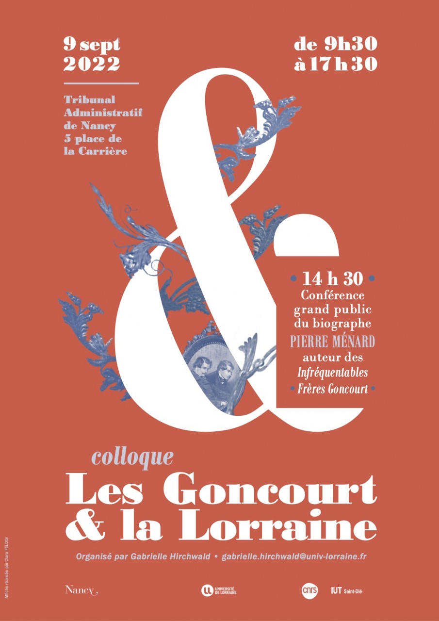 A l’occasion du bicentenaire de la naissance d’Edmond de Goncourt à Nancy, plusieurs manifestations se déroulent durant l’année 2022 consacrées plus largement aux frères Goncourt ainsi qu’à l’Académie Goncourt. Étant donné les liens qui associent la famille Goncourt à la Lorraine, il semblait pertinent d’organiser un colloque universitaire dans la ville natale d’Edmond, avec un choix de date concomitant à un événement lorrain : le Livre sur la Place, premier salon littéraire de rentrée.