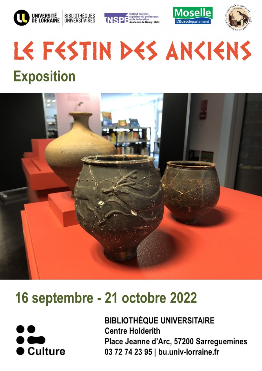 La promotion 2021-2022 des étudiants Post-MEEF de l'INSPE de Lorraine - Site de Sarreguemines a travaillé à présenter et à didactiser trois œuvres de l'artiste Constance de Lagaye consacrées aux Banquet de Trimalcion,ainsi que des artéfacts antiques des IIe et IIIe siècle ap. J.-C. issus des collections du Parc archéologique européen de Bliesbruck-Reinheim et prêtés pour l’occasion. Au moyen de kakémonos pédagogiques, le spectateur peut saisir l'évolution des pratiques de la fête, du banquet, du festin de l'Antiquité jusqu'au début du Moyen-Âge.