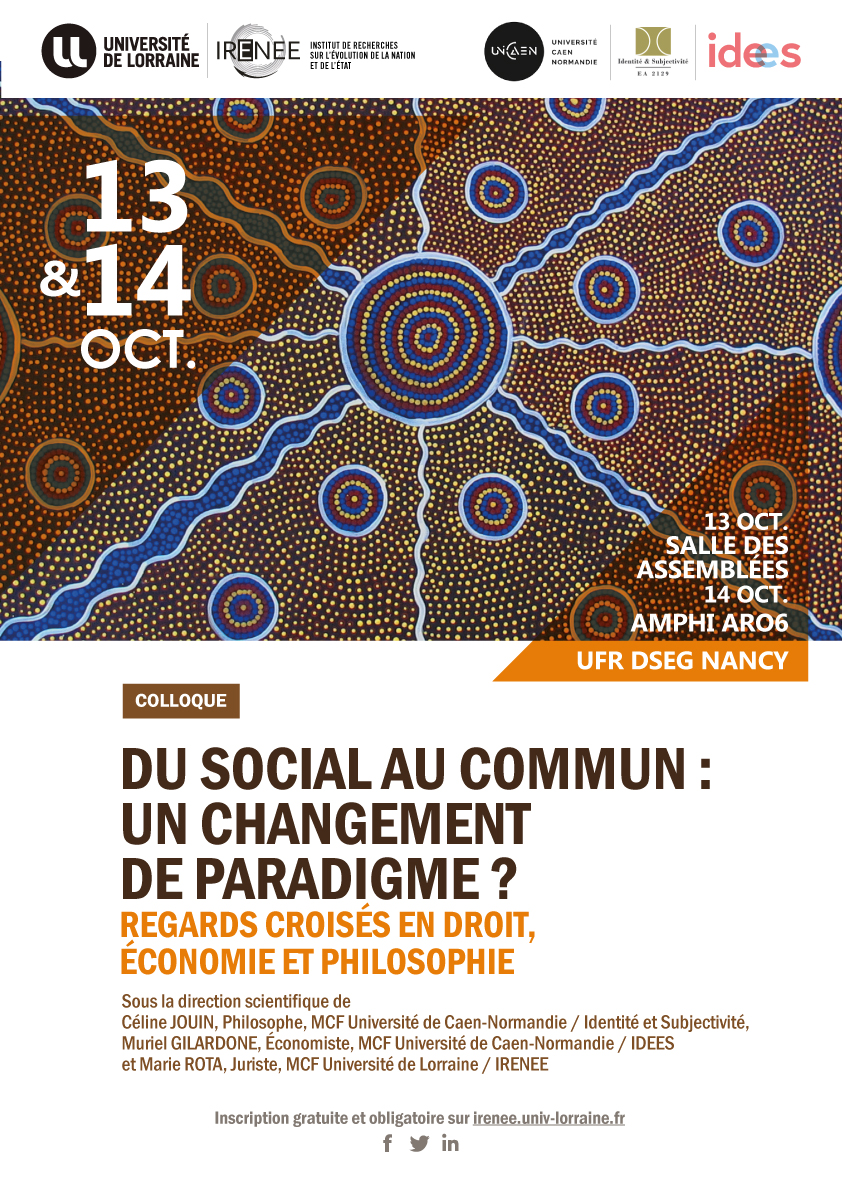 Les revendications autour du commun apparues dans les mouvements altermondialistes et écologistes prennent pour référence l’ancien terme anglais de « commons » désignant les terres que les anciens droits coutumiers permettaient d’utiliser dans les campagnes européennes avant qu’une vague de « mise en clôture » (ou d’enclosures) ne viennent les transformer en propriété privée. La référence aux communaux comme au mouvement des enclosures est devenue paradigmatique dans la réflexion actuelle sur la marchandisation accrue du capitalisme avancé. La vogue que connaît le terme de « commun » est liée à l’exigence de restaurer la solidarité quand les montages institutionnels de l’État social, qui la réalisaient dans une certaine mesure, sont en voie de démantèlement. Mais elle est aussi liée à l’exigence de prendre en compte la crise écologique alors que les traditions du socialisme l’ont largement ignorée et l’ont laissé s’intensifier dans leur dos. Elle conduit alors à repenser le sujet de droit et ses relations avec l’État. Le but de ce colloque est d’interroger l’articulation du social et du commun, du point de vue du droit, de l’économie et de la philosophie. La perspective se veut programmatique et constructive (comment articuler l’écologie politique et le droit social ou l’économie publique ?) mais elle compte aussi mobiliser les instruments conceptuels légués par les sciences sociales, qui, depuis F. Tönnies et Max Weber, distinguent la « société » et la « communauté ».