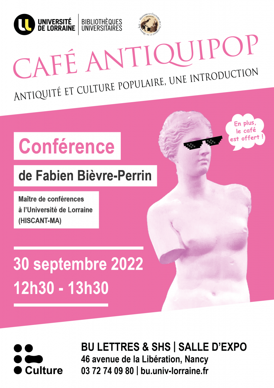Fabien Bièvre-Perrin, Maître de conférences au laboratoire HISCANT-MA de l'Université de Lorraine, animera la conférence Antiquipop, intitulée "Antiquité et culture populaire, une introduction" qui aura lieu dans la salle d'exposition de la Bibliothèque universitaire de Lettres, Sciences humaines et sociales de Nancy, le 30 septembre 2022 de 12h30 à 13h30.