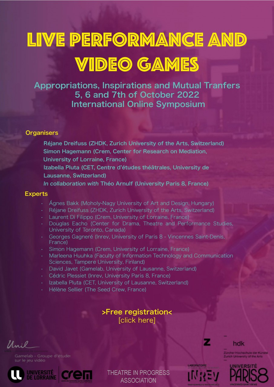 Narrative strategies, immersion, interaction, identification, multimodality, characters and the relationship between physical and virtual worlds: the fields of investigation concerning the complex relationship between live performance and video games are numerous and compound. This symposium will bring together specialists in the field and will provide an overview of research into this relationship.