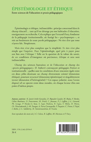 Comme le précise la quatrième de couverture épistémologie et éthique seraient indissociables. C’est en tout cas « un principe consensuel dans le champ éducatif… tant qu'il ne dérange pas nos habitudes d'éducation, enseignement ou recherche. Cela explique que Fernand Oury, fondateur de la pédagogie institutionnelle, ait fustigé les « psychopompes », et mis au fondement de toute parole pédagogique : Ne rien dire que nous n'ayons fait. Simplement. Mais rien n'est plus complexe que la simplicité. Et rien n'est plus simple que l'esquiver. Pour l'épistémologie, quel prix à payer pour son lien avec l'éthique ? Telle est la question de la valeur du savoir, de ses conditions d'émergence où pertinence, éthique et sens sont indissociables. Champ des sciences humaines et de l'éducation et champ des « praxis pédagogiques » (F. Imbert) convoquant pédagogies Freinet et institutionnelle : quelles sont les conditions d'une rencontre égale entre ces deux pôles dessinant un champ diversement orienté (dimension éthique), pourtant structuré (dimension épistémique) et singulièrement investi (dimension d'hétérogénéité) ? Cet espace polarisé, nous l'avons disposé tel un spectre entre deux mondes, où chaque lecteur élira son point d'habitat propre ».