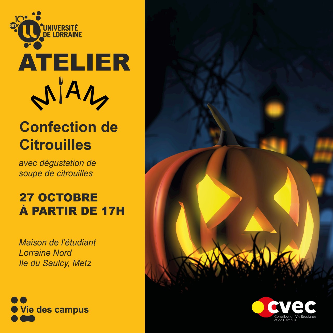L'équipe du jardin partagé de la Maison de l'Étudiant Lorraine Nord vous invite à cet atelier thématique le jeudi 27 octobre à partir de 17h (il est possible d'arriver cet horaire et de commencer l'atelier en cours de route). Vous n'avez rien à apporter, tout est fourni : les citrouilles et les ustensiles. Et c'est gratuit !