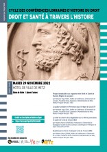 Dans le cadre du cycle des conférences lorraines d’Histoire du Droit, Monsieur Hugo Stahl, Maître de conférences à l'Université de Lorraine, propose un nouveau rendez-vous historique autour du droit et de la santé avec le soutien et le concours de la Faculté de Droit, Économie et Administration de Metz, de l'Institut François Gény et de la Ville de Metz.