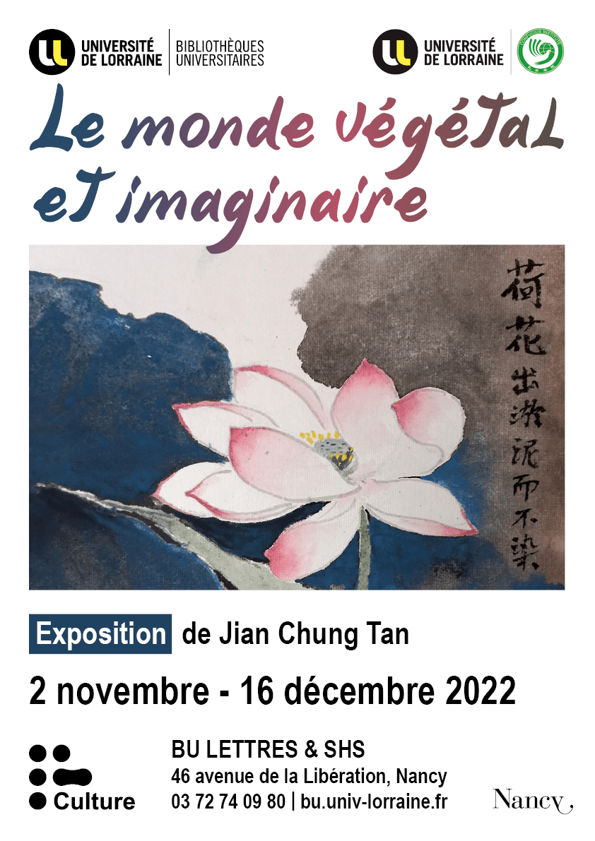 La bibliothèque universitaire de Lettres, Sciences humaines et sociales de Nancy et l'Institut Confucius de l'Université de Lorraine proposent l'exposition des œuvres de Jian Chung Tan "Le monde végétal et imaginaire" du 2 novembre au 16 décembre 2022 en salle d'exposition du rez-de-chaussée.