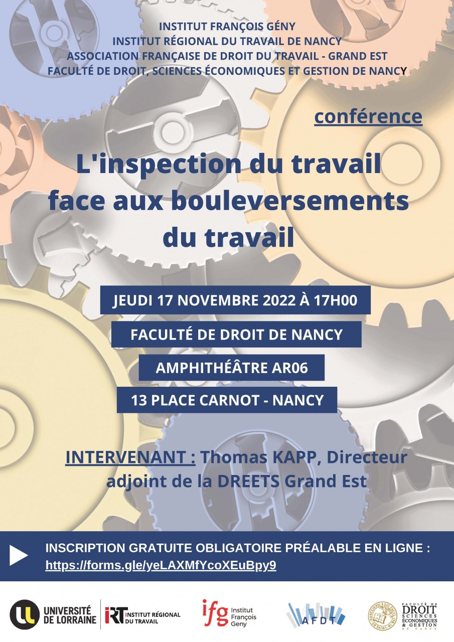 Dans le cadre du cycle de conférences de l'AFDT Grand Est, l'Association Française de Droit du Travail et de la Sécurité sociale, l'Institut Régional du Travail de Nancy, l'Institut François Gény et la Faculté de Droit, Sciences économiques et Gestion de Nancy vous proposent une conférence de Thomas Kapp, Directeur régional adjoint de la DREETS Grand Est.
