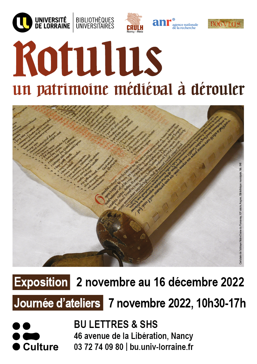 La bibliothèque universitaire de Lettres, Sciences humaines et sociales de Nancy propose l'exposition "Rotulus, un patrimoine médiéval à dérouler", du 2 novembre au 16 décembre 2022 au 1er étage de la bibliothèque.