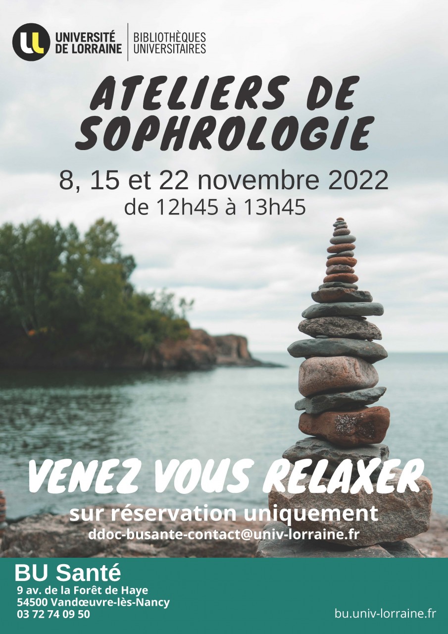 En partenariat avec le SUMPPS (Service Universitaire de Médecine Préventive et de Promotion de la Santé), la bibliothèque universitaire de Santé vous propose des ateliers de découverte de la sophrologie les mardis 8, 15 et 22 novembre 2022, de 12h45 à 13h45.