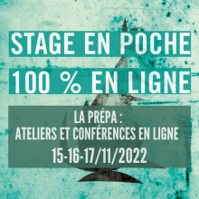 - Inscription obligatoire sur la plateforme Stage en poche, rubrique « Ateliers et conférences », du vendredi 28 octobre au mardi 15 novembre 2022