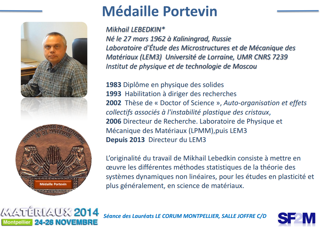 Le Conseil de la Société Française de Métallurgie et de Matériaux (SF2M) a décidé de décerner la médaille Portevin 2014 à Mikhail Lebedkin, Directeur de recherche CNRS et directeur du Laboratoire d’Étude des Microstructures et de Mécanique des Matériaux (LEM3).