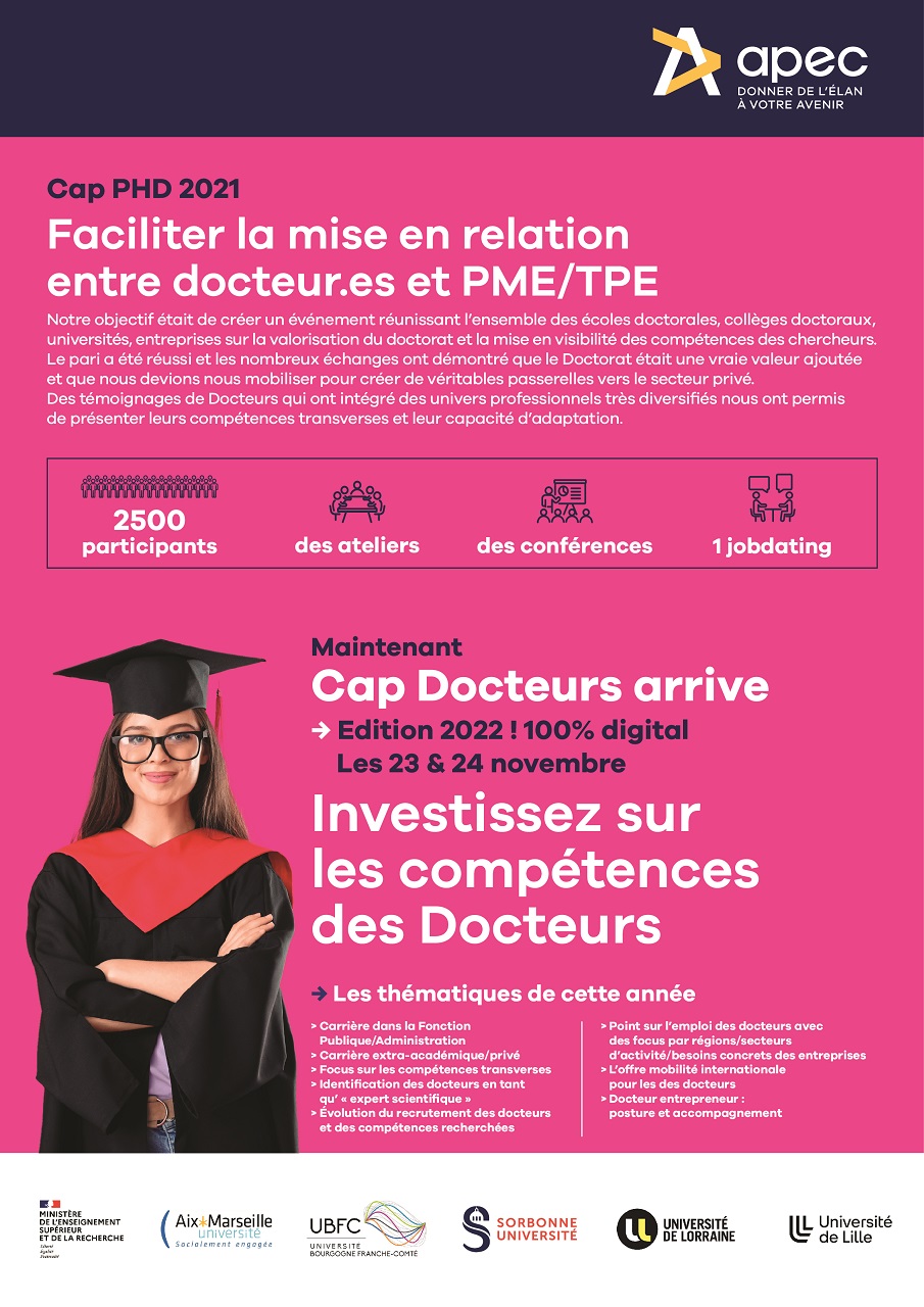 L’APEC – Association pour l’Emploi des Cadres organise 2 jours de conférences les 23 et 24 novembre sur la valorisation du doctorat et la poursuite de carrière. Le réseau alumni docteurs de l’université de Lorraine participe à l’organisation de cet évènement.