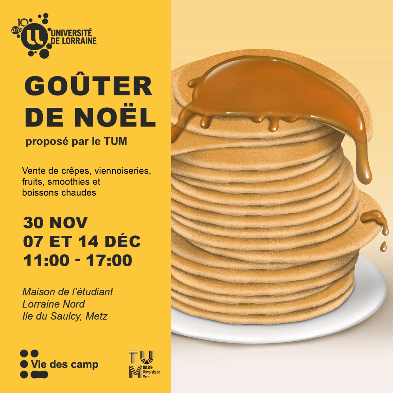 L'association étudiante du Théâtre Universitaire de Metz (le TUM) vous propose son goûter de Noël, tous les mercredis jusqu'aux vacances, à la MDE Lorraine Nord.