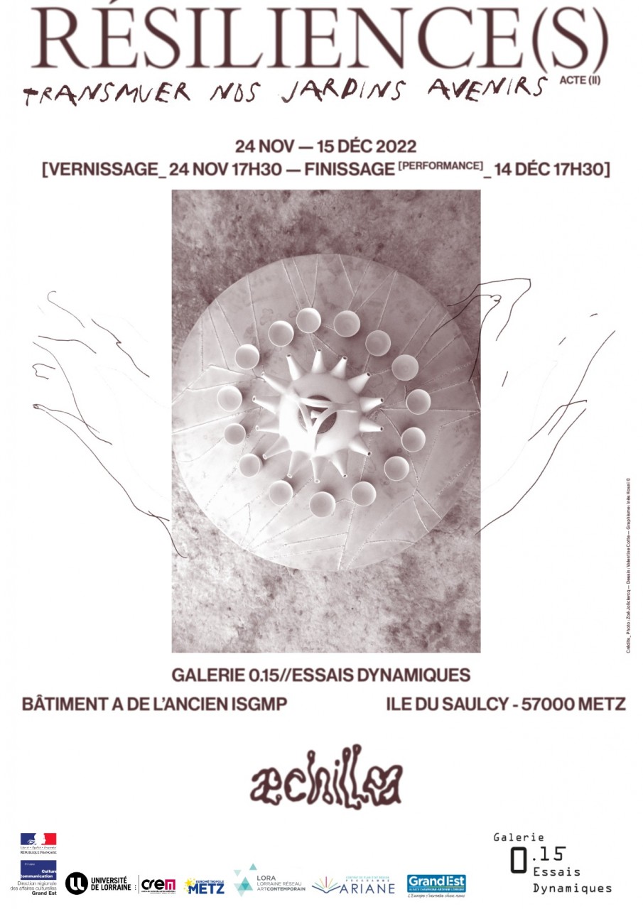 Résilience(s) est une exposition résultant d’un an de recherche plastique et théorique, autour des pratiques et notions d’auto-soin. Les artistes, qui sont aussi rechercheur.euses et curateur.ices, proposent des œuvres et actions à partir des histoires de leurs corps, en ce que les protocoles de création sont eux- mêmes résilients, dans une politique de l’intime. Une façon de « prendre soin » par l’intermédiaire d’objets, de leurs transformations, de gestes composites et performantiels. Une façon aussi de questionner les mondes à venir, et la façon dont nous y cultivons nos propres corps-jardins. Résilience(s) est justement né d’une urgence à revenir vers soi, ensemble. Ainsi dans une démarche éco-féministe et éco-queer, iels ont invité des allié.e.s et adelphes pour prendre place avec elleux, et (ré)inventer de nouveaux espaces. Les artistes tentent de faire acte de vulnérabilités communes, tissant des liens, interrogeant la possibilité de «prendre place» en tant que personnes sexisé.es et issu.es de minorités. Iels parlent d’un «care» dans la multiplicité de son interprétation, dans l’envie de répara(c)tions, et de proposer des lieux ressources.