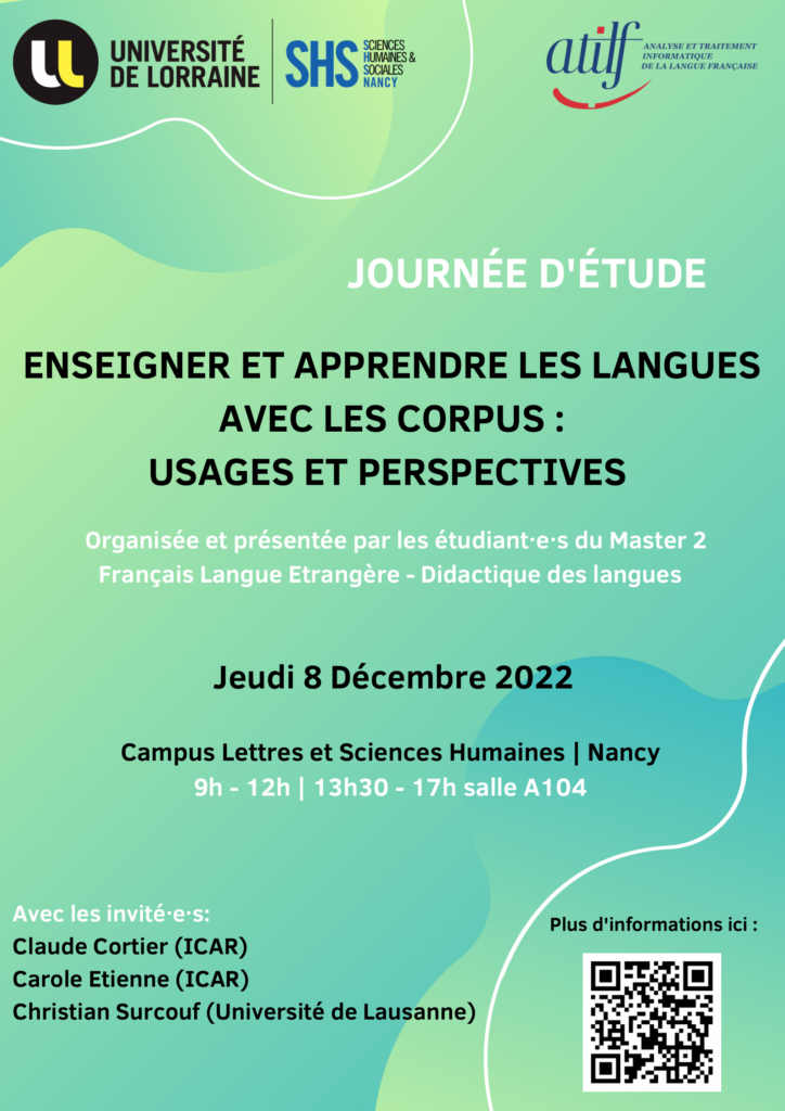 Les étudiant·e·s du Master Français Langue Étrangère (FLE) 2ème année de l’Université de Lorraine vous invitent à assister à une journée d’étude questionnant l’utilisation des corpus dans l’enseignement/apprentissage des langues.