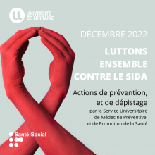 Le Service Santé Social des étudiants (SUMPPS) et le CeGIDD du CHRU de Nancy, en collaboration avec les étudiants de la Faculté de Médecine, le CROUS, la CPAM 54, la MGEL/YVON, et avec le soutien de l’ARS et de la Région Grand Est, proposent aux étudiants Lorrains de Nancy, le jeudi 8 décembre, une campagne de sensibilisation à la prévention et aux dépistages du VIH et des autres IST, à l’occasion de la Journée Mondiale de lutte contre le SIDA.