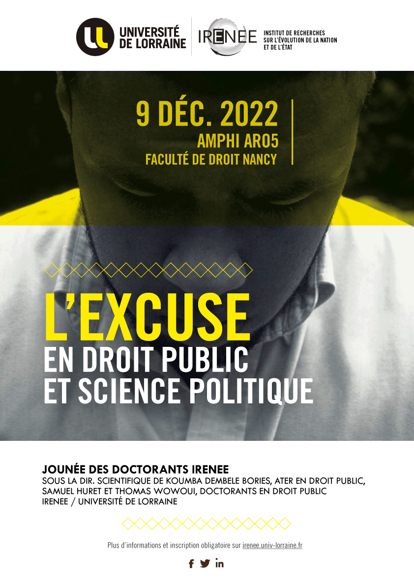 Cette journée d’études des doctorants se proposera donc, au gré des différentes manifestations de l’excuse en droit public et science politique, d’en identifier la substance et les fonctions.