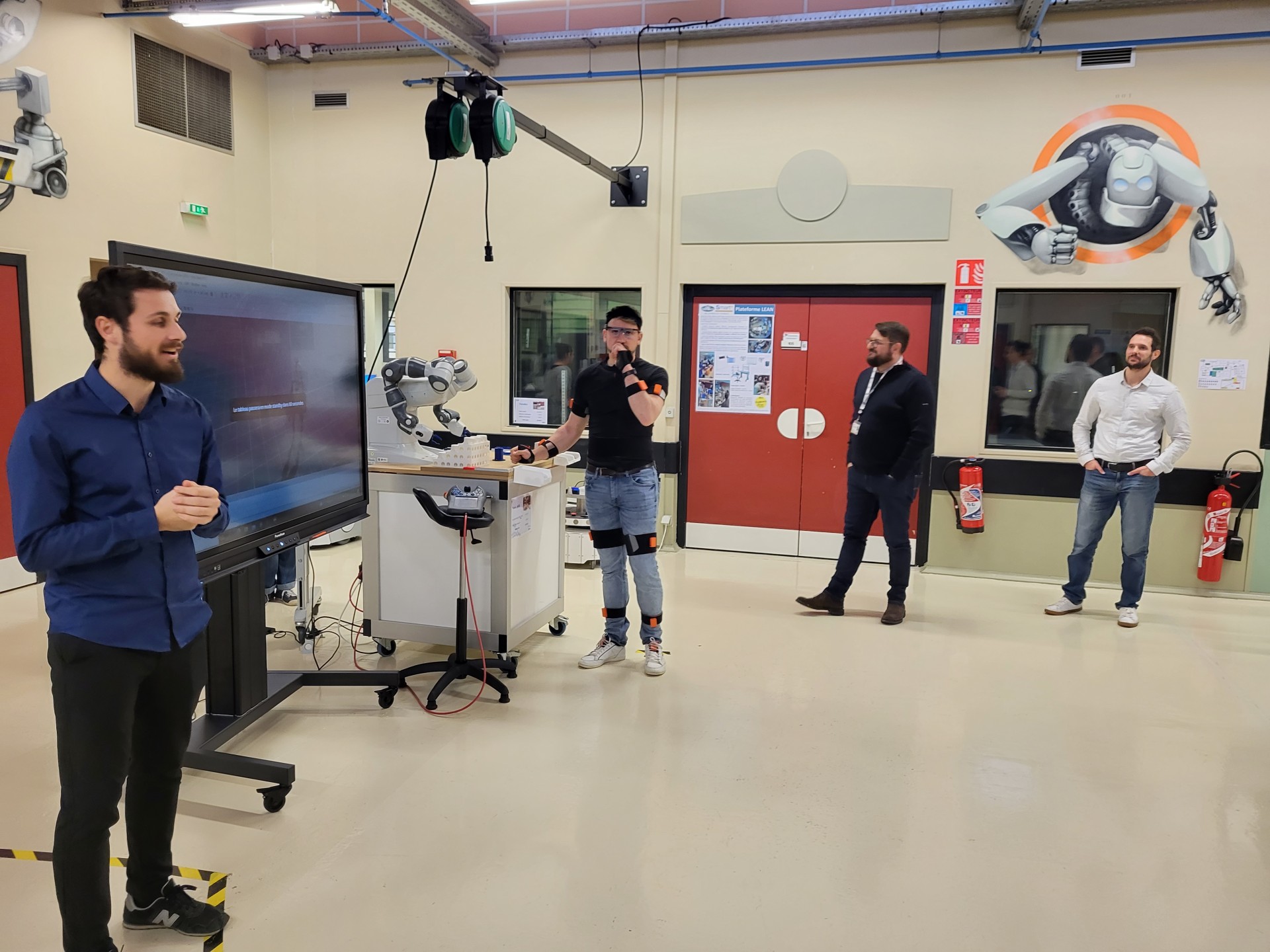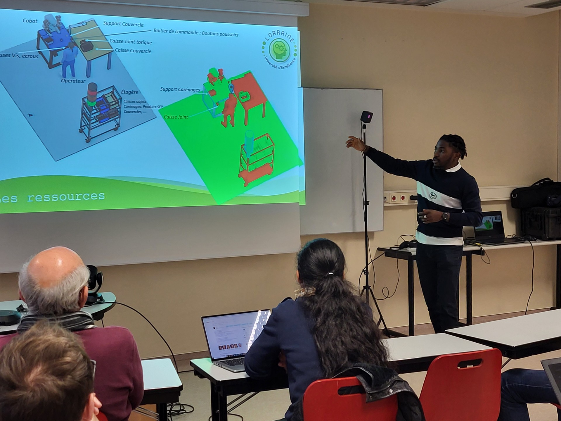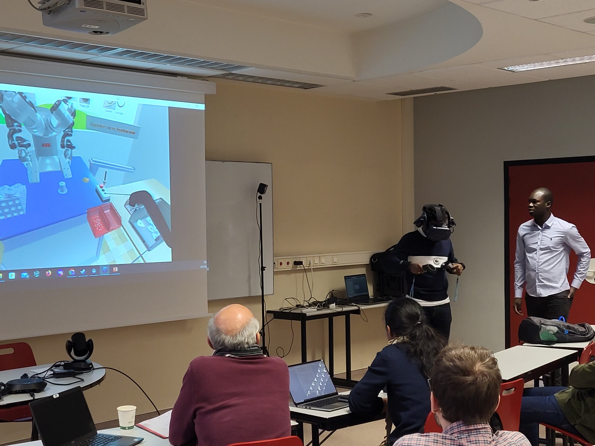 Le deuxième temps consistait en des démonstrations : la première, présentée par Kevin Bouillet, doctorant au laboratoire DevAH, a permis aux acteurs présents de comprendre les enjeux d’une situation de travail collaborative entre l’humain et le cobot, en termes d’ergonomie physique et cognitive. La seconde présentation, animée par Christian Tchounke (Ditex), a mis en lumière les questionnements qui gravitent autour de la réalité virtuelle et d’un jumeau numérique comme outils de formation, vecteurs d’acceptation pour les opérateurs, et indicateurs pertinents pour la stratégie entrepreneuriale.