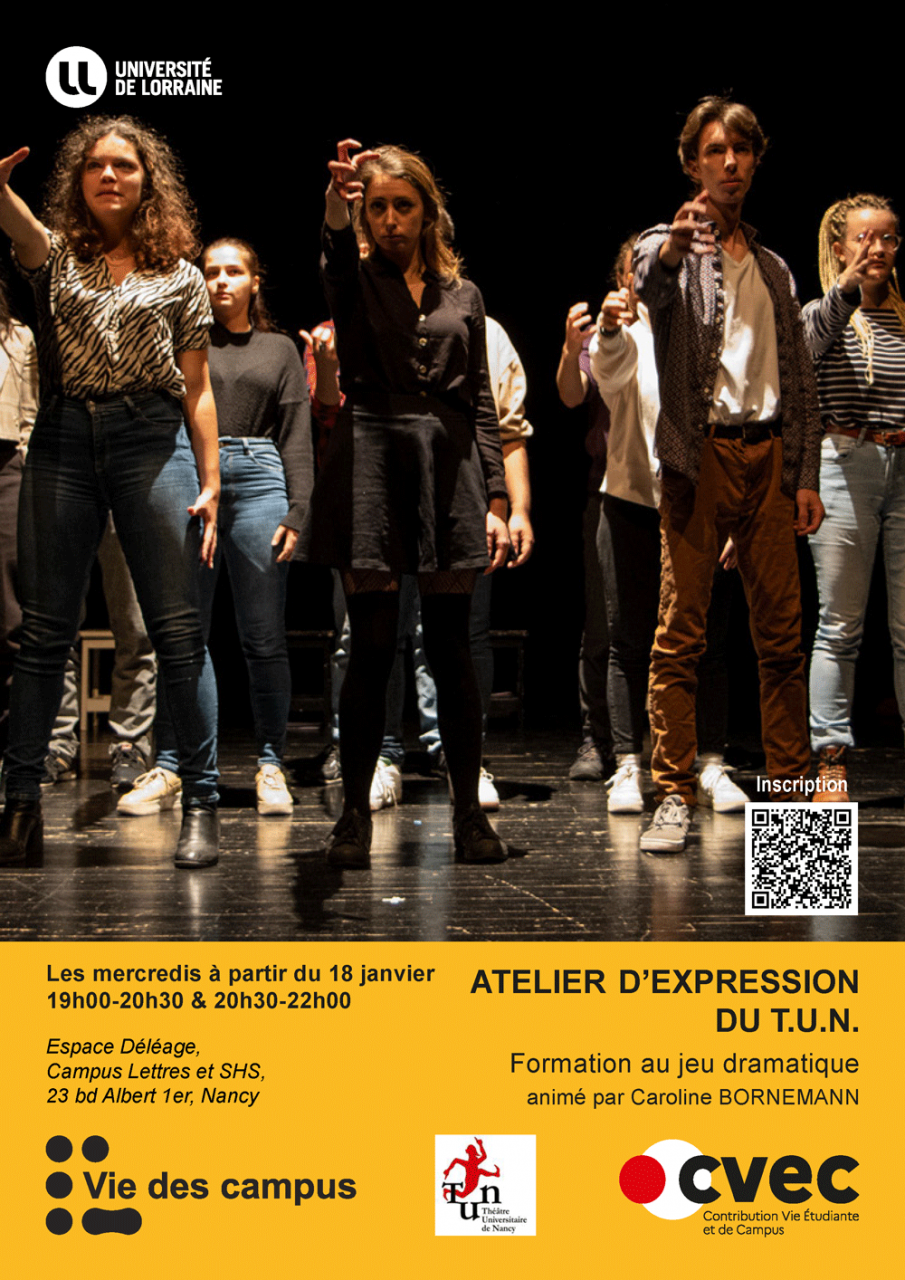 Cet atelier du Théâtre Universitaire de Nancy (T.U.N.) propose une formation au jeu dramatique par des séances collectives.