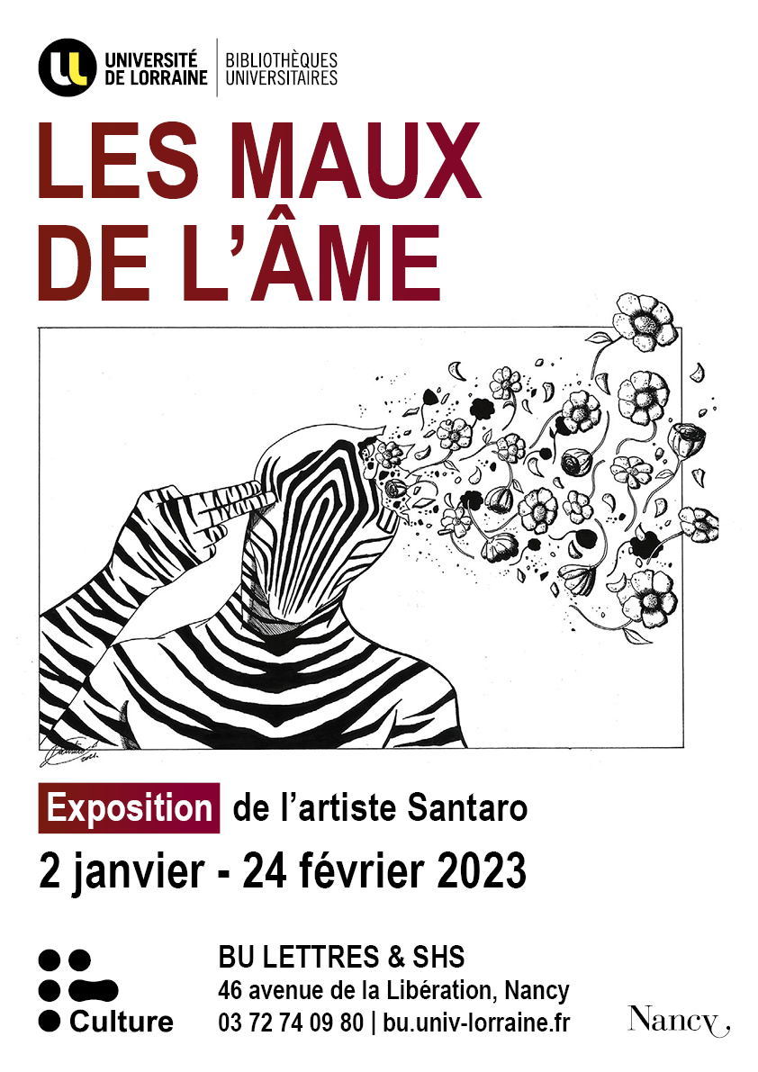 Venez découvrir l'exposition "Les Maux de l’âme" de l'artiste Santaro, du 2 janvier au 24 février 2023, accessible gratuitement dans la salle d'exposition de la bibliothèque universitaire de Lettres, Sciences humaines et sociales de Nancy.