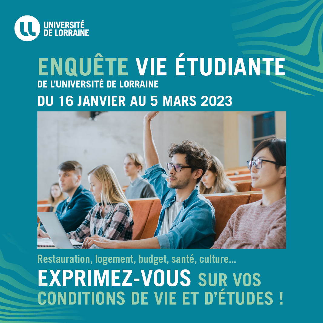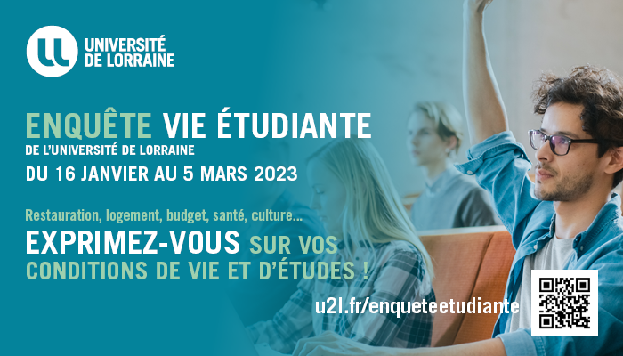 Les conditions de vie et d’études constituent un facteur essentiel de la réussite universitaire. Afin de dresser un état des lieux complet des conditions de vie et d’études de ses étudiant(e)s, l’Université de Lorraine lance une grande enquête « Vie étudiante ».