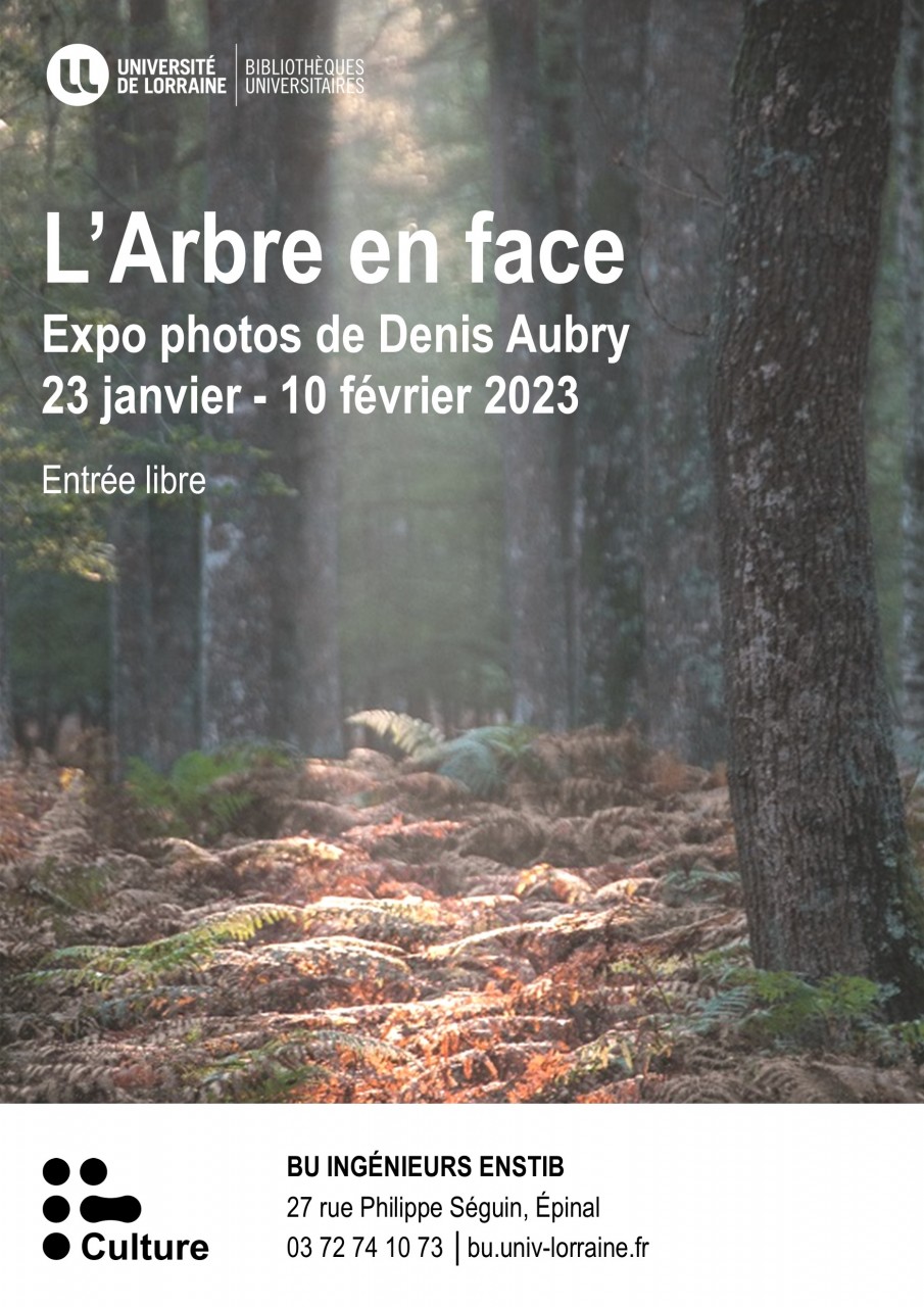 La bibliothèque universitaire Ingénieurs ENSTIB vous invite à découvrir une sélection de photographies d’arbres, tirée du dernier ouvrage du photographe Denis Aubry, intitulé L'Arbre en face, 3e volume de la collection PoésImages réalisée avec le poète Philippe Mitre. Denis Aubry présente ainsi son travail :