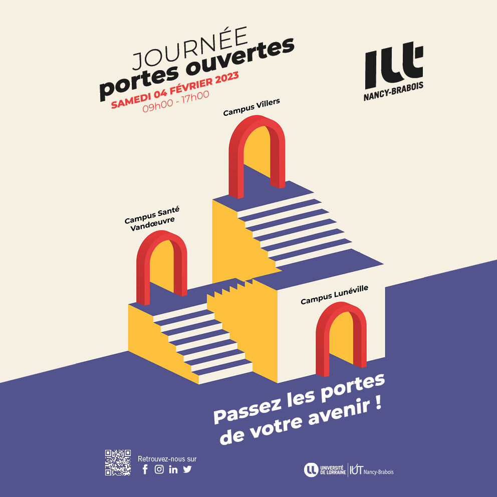 Samedi 4 février prochain, l'IUT Nancy-Brabois ouvre les portes de ses trois campus durant toute la journée. Cette Journée Portes Ouvertes sera l'occasion d'échanger avec nos étudiants et enseignants sur les différentes formations que nous proposons.