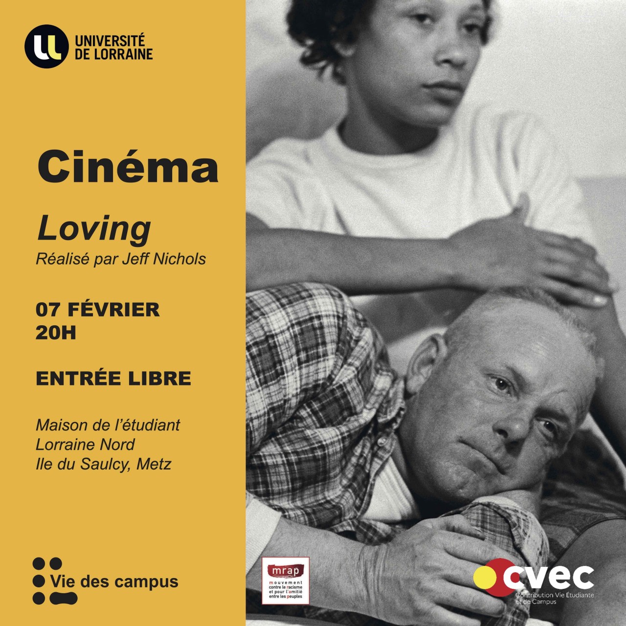 La Maison de l'étudiant Lorraine Nord et l’association MRAP (Mouvement contre le racisme et pour l’amitié entre les peuples) vous propose Loving, un drame basé sur une histoire vraie, d’un couple se battant pour l’amour et contre le racisme de toute une époque et ça sera à la MDE Lorraine Nord, le 7 février à 20h.