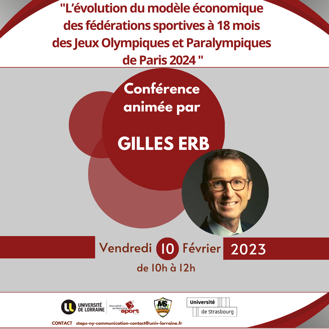 Nous aurons l'honneur de recevoir pour l'occasion Gilles ERB : professeur agrégé d'EPS, Docteur en STAPS à l'Université de Strasbourg. Il est aussi Président de la Fédération Française de Tennis de Table et élu au Bureau Exécutif du CNOSF, en charge des territoires.