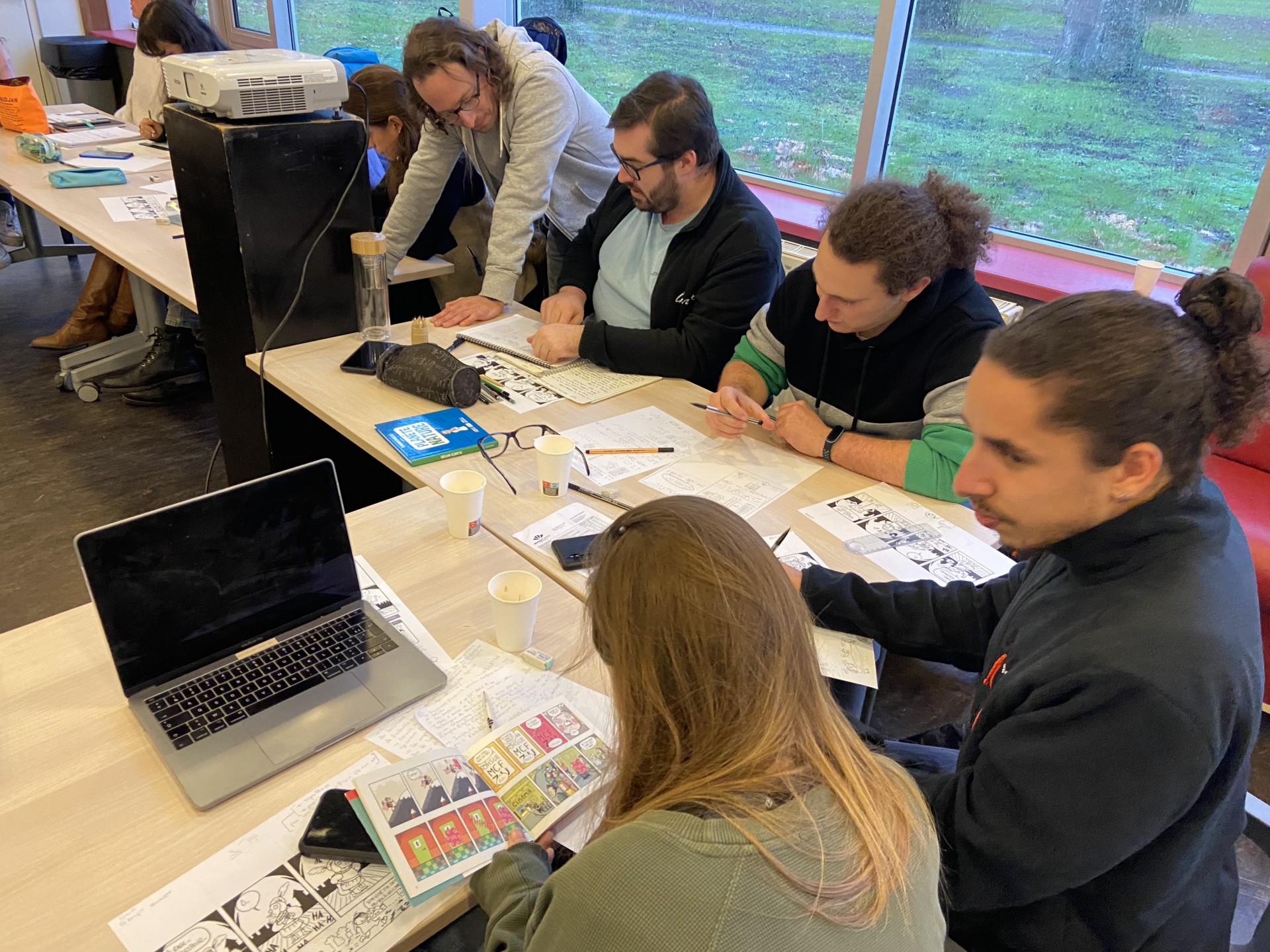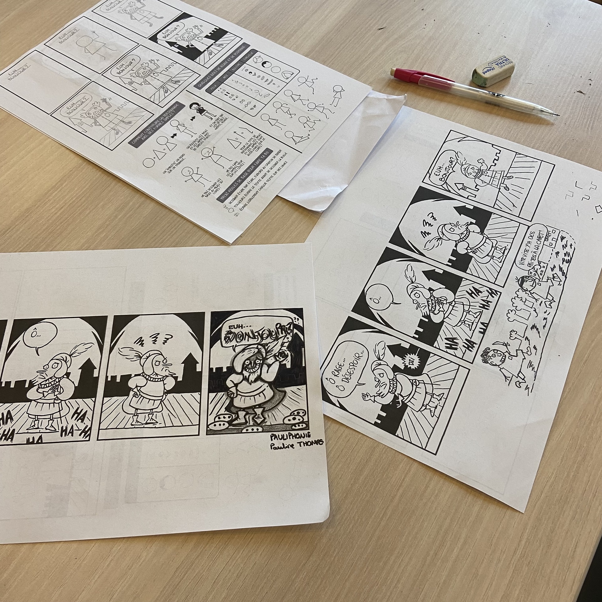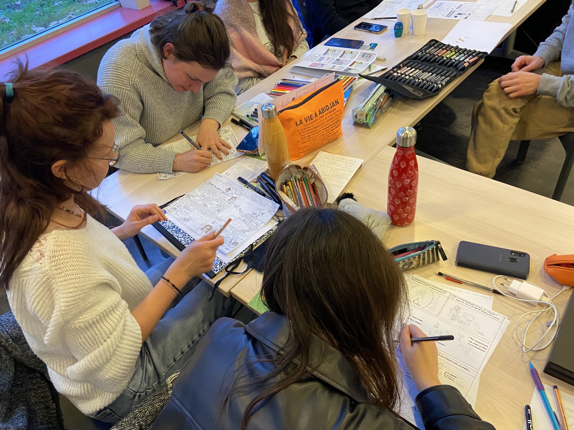 La première matinée a permis une approche globale du dessin en bande dessinée sous l’angle des formats possibles (gag, dessin de presse…) avec un point sur les techniques du dessin à l’encre (réaliste, science-fiction…) et le matériel utilisé. Après une première mise à niveau pratique sur les règles élémentaires de création d’un personnage type, chacun et chacune a identifié, lors d’un tour de table, une notion clé de son sujet de thèse à illustrer.