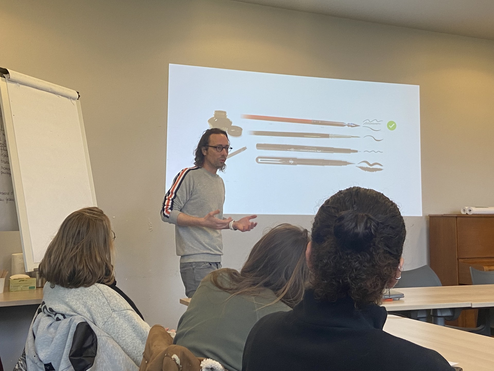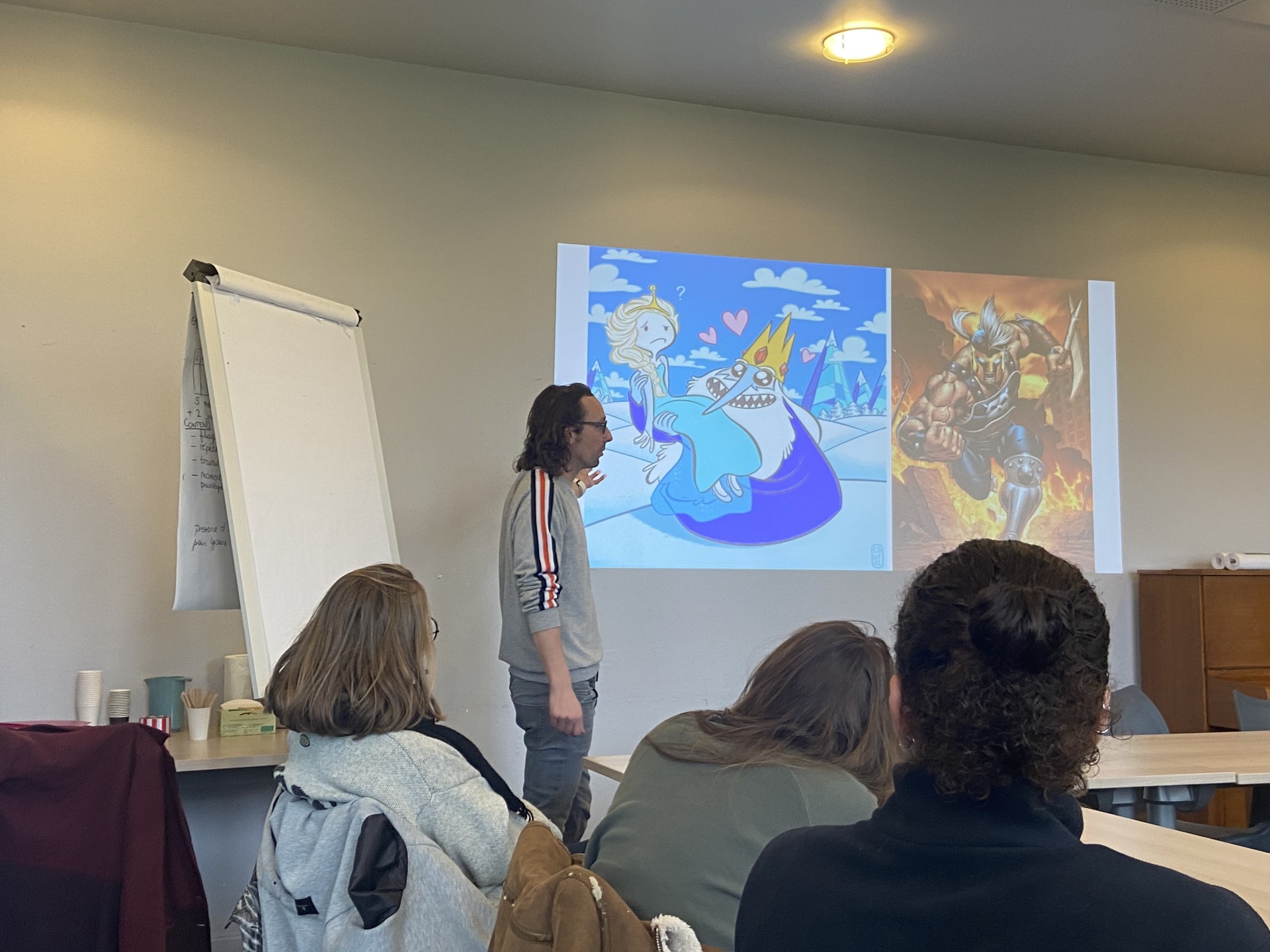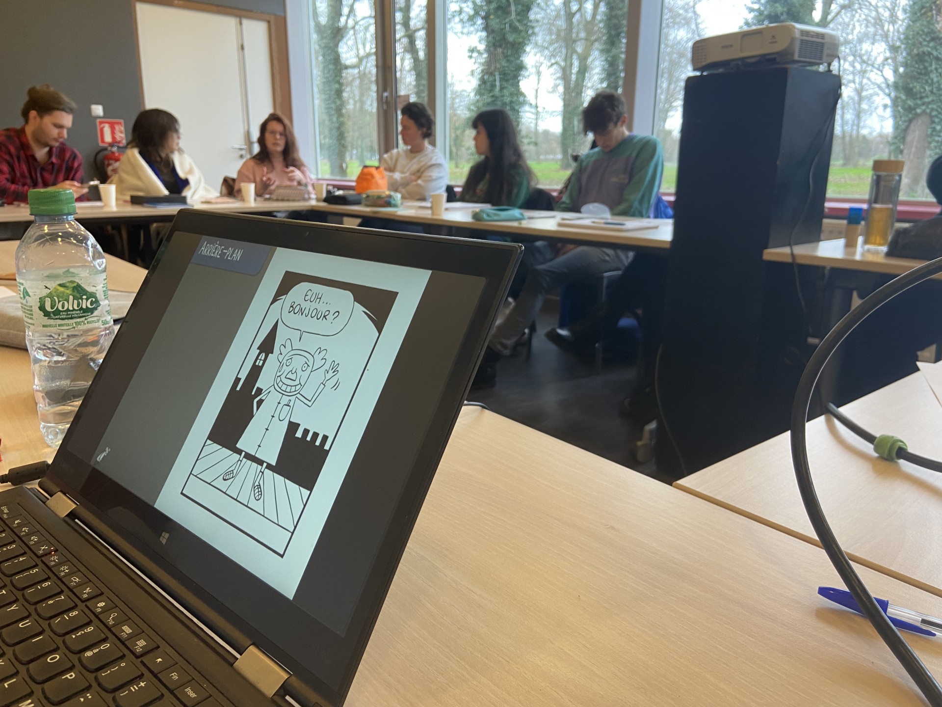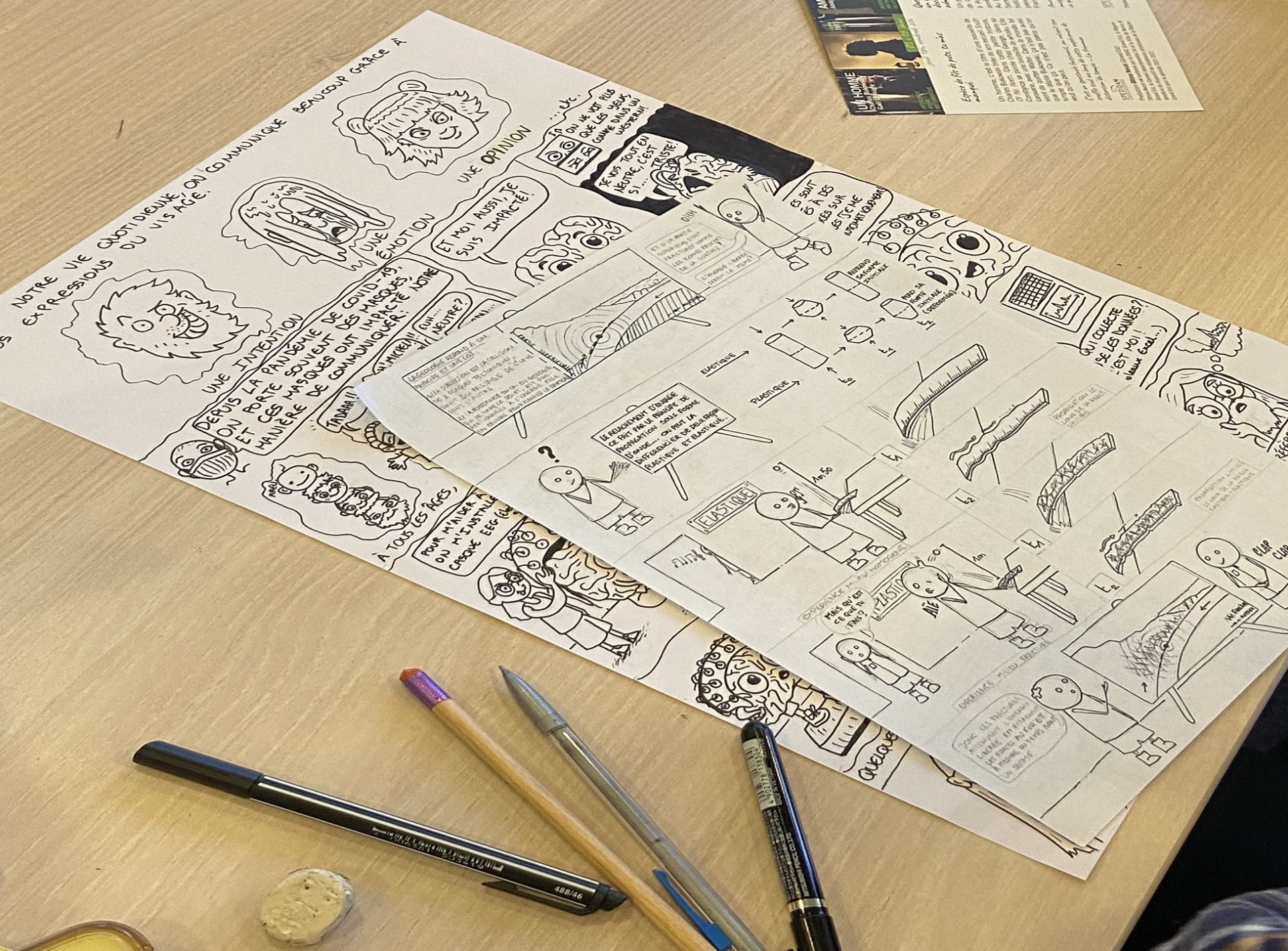 La première matinée a permis une approche globale du dessin en bande dessinée sous l’angle des formats possibles (gag, dessin de presse…) avec un point sur les techniques du dessin à l’encre (réaliste, science-fiction…) et le matériel utilisé. Après une première mise à niveau pratique sur les règles élémentaires de création d’un personnage type, chacun et chacune a identifié, lors d’un tour de table, une notion clé de son sujet de thèse à illustrer.