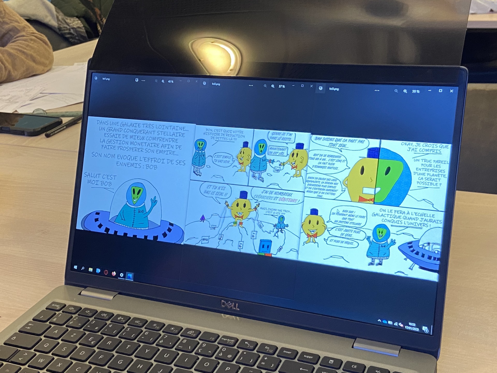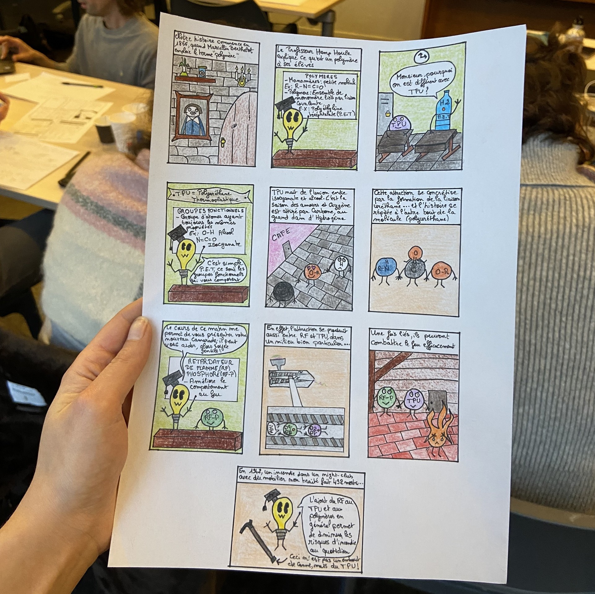 Des thèmes aussi variés que le polymère, la dégradation des sols, territoire et jeux vidéos, la narration-puzzle, le middle-management ou la théorie des graphes ont pu être scénarisés à l’aide du formateur. La réflexion était à la fois portée sur le dessin et sur le texte, avec l’utilisation de procédés humoristiques, de synthétisation du propos ou encore de l’ellipse. À l’issue de ces deux journées, des planches vulgarisées des notions scientifiques en noir et blanc et certaines en couleur ont émergé. Elles pourront être réutilisées ultérieurement dans les différents supports de présentation employés par les doctorants et doctorantes pour étoffer la présentation de leurs démarches de recherche ou dans des contextes de médiation scientifique auprès de différents publics.