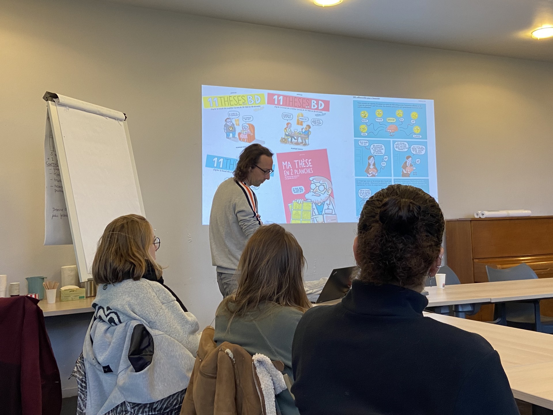 Lundi 16 et mardi 17 janvier avait lieu, sur le campus du Saulcy (Metz), la formation « Médiation scientifique et bande dessinée » destinée à faire le lien entre travaux de recherche et scénarisation avec ce medium. Douze doctorantes et doctorants ont participé aux deux journées animées par le scénariste Pierre-Étienne Bertrand (PEB), auteur de plusieurs albums de vulgarisation scientifique. L’occasion d’exposer et d’aider les personnes inscrites à s’approprier les filons du métier.