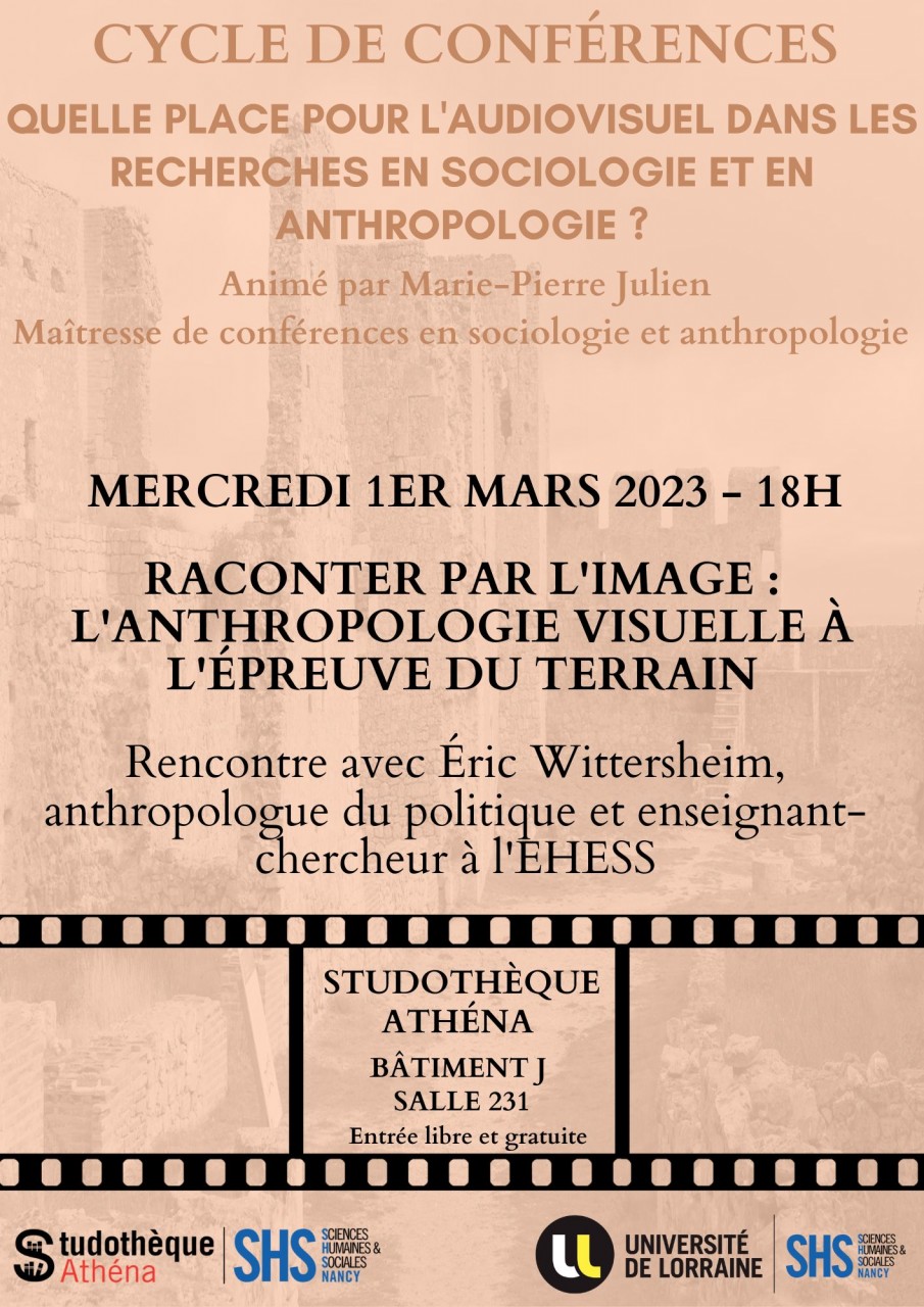 Dans le cadre de son cycle de conférences intitulé "Quelle place pour l'audiovisuel dans les recherches en sociologie et en anthropologie ?" et animé par Marie-Pierre JULIEN (maîtresse de conférences en sociologie et anthropologie à l'Université de Lorraine), la Studothèque Athéna vous propose une rencontre avec Eric WITTERSHEIM intitulée "Raconter par l'image : l'anthropologie visuelle à l'épreuve du terrain".