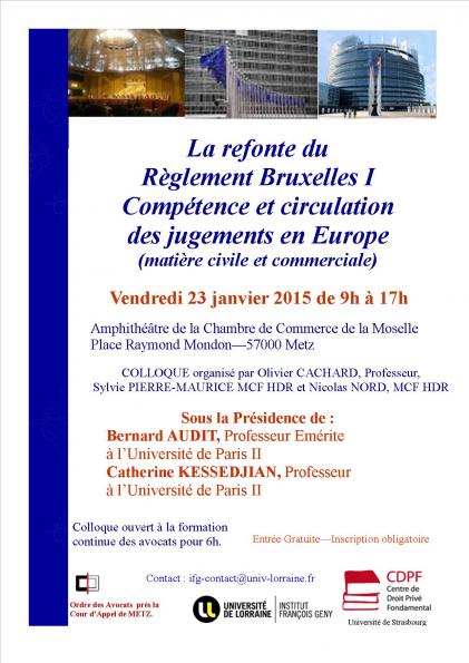Le thème de la manifestation concerne la refonte du règlement européen 44/2001 Bruxelles I et sa substitution par un nouveau règlement, le règlement 1215/2012. Ces règlements européens s'appliquent en "matière civile et commerciale" et concernent aussi bien la compétence, la reconnaissance que l’exécution des jugements et actes authentiques au sein de l'Union.