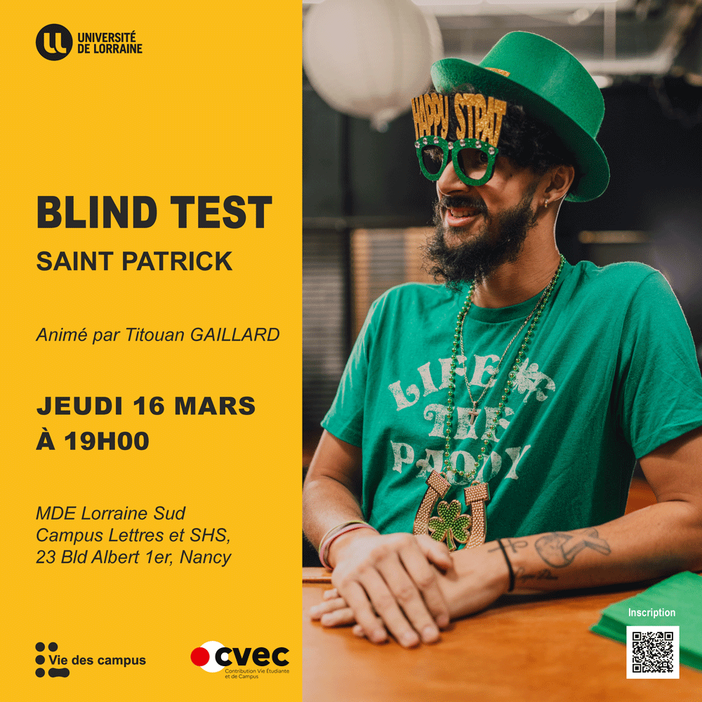 Pour participer, il te suffit de t'inscrire ici : https://www.eventbrite.fr/e/billets-blind-test-saint-patrick-566387750007