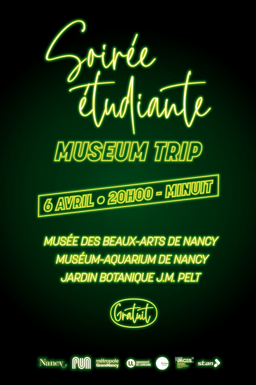 Rendez-vous pour la 21e édition de la soirée étudiante "Museum trip" organisée chaque année par les musées de Nancy et de la Métropole du Grand Nancy. Une soirée gratuite entièrement dédiée aux étudiants à retrouver cette année dans les établissements participants : musée des Beaux-Arts, Jardin botanique Jean-Marie Pelt et Muséum-Aquarium. Et à ne rater sous aucun prétexte !