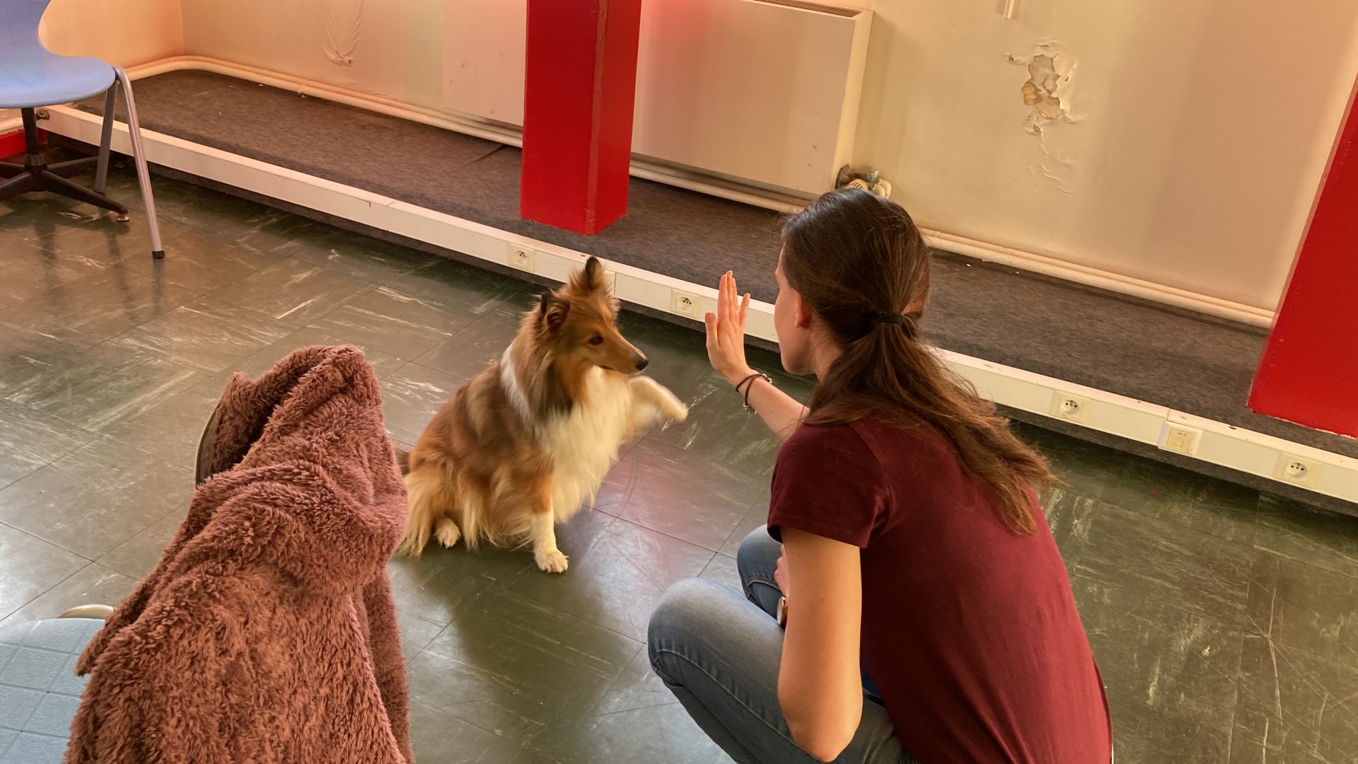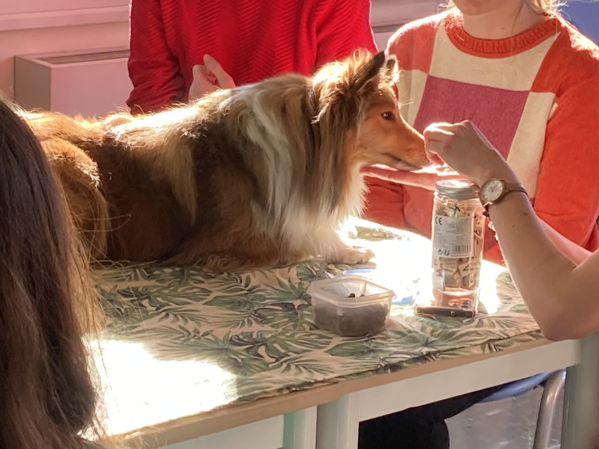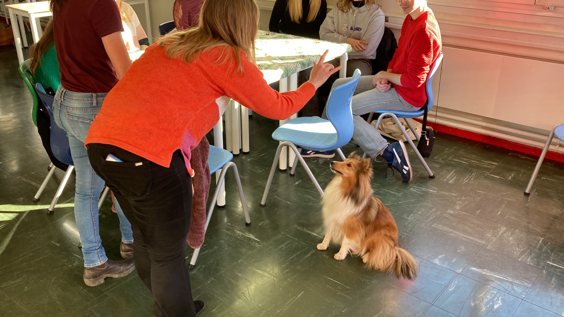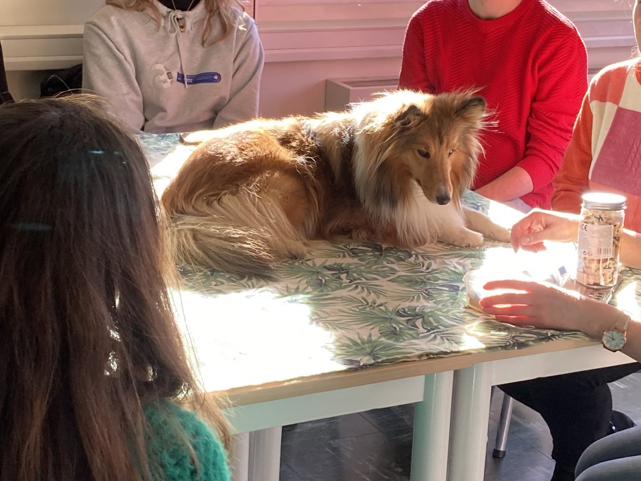 Avec le chien : L’autre groupe était réuni autour de Pix’elle, un chien berger des Shetlands de 3 ans. Pendant cette séance, l’intervenante invite les étudiants à écrire des actions simples avec des lettres éparpillées sur la table que le chien devra exécuter. Les uns après les autres, les étudiants font exécuter l’ordre au chien, soit en le disant simplement ou en essayant de trouver un moyen de lui faire faire. Pix’elle reçoit une récompense une fois l’action réalisée.