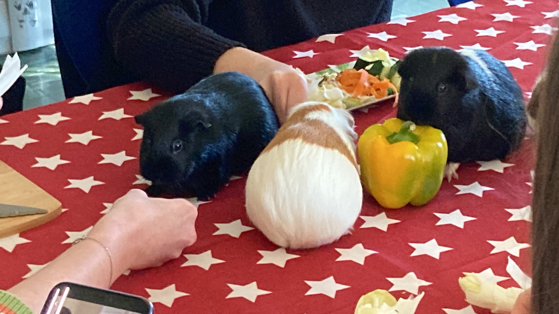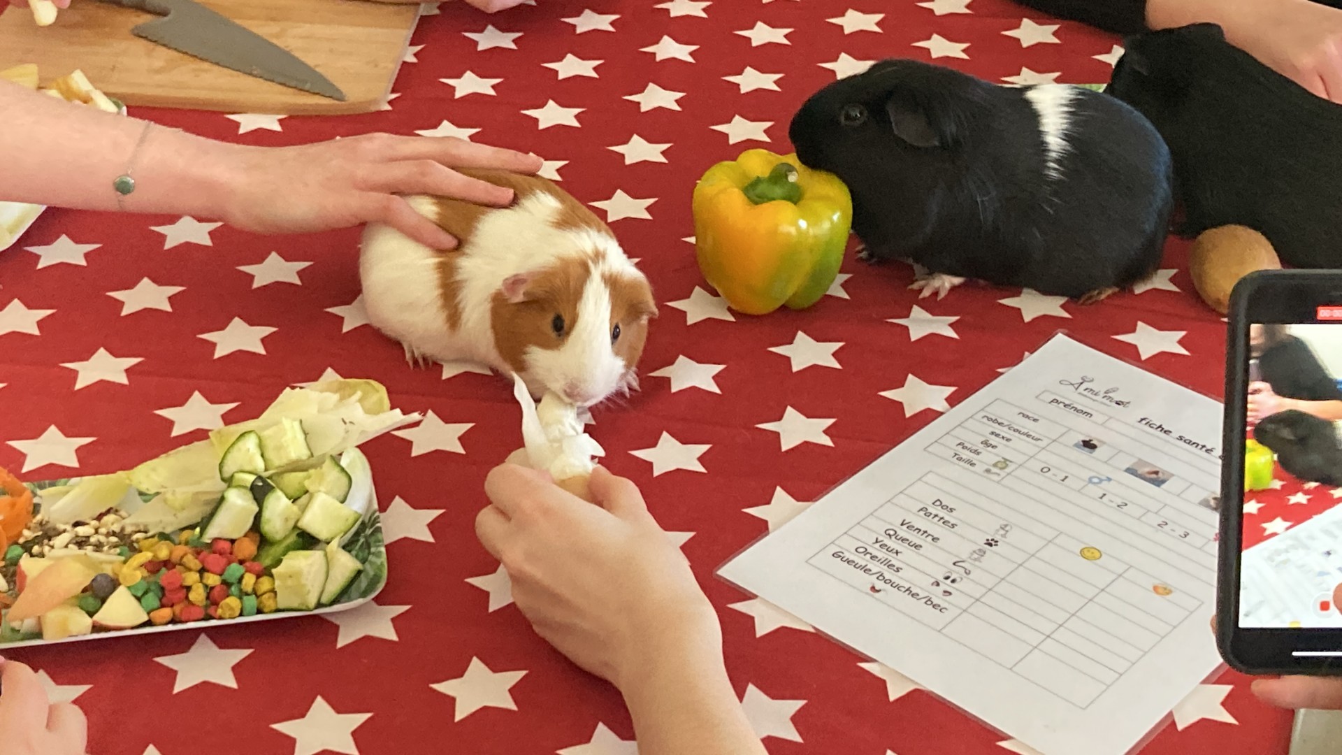 Avec les rongeurs : Sur la table, se trouve du matériel de découpe et des plateaux pour préparer et stocker légumes et graines pour les animaux. L’intervenante sort tous les rongeurs de leur cage : cochons d’Inde, lapin et chinchilla. Une fois le contact établit entre les animaux et les étudiants, l’intervenante dispense des consignes aux étudiants afin qu’ils puissent leurs donner les aliments qu’ils avaient précédemment préparés.
