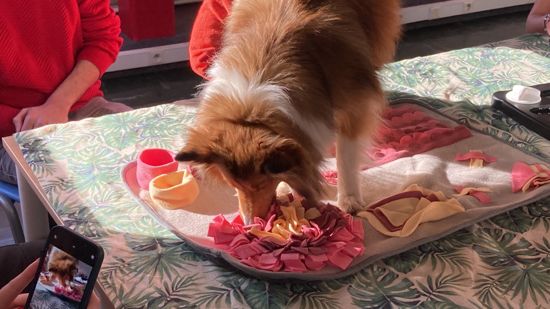 La dernière partie de la séance consistait à cacher des croquettes dans un tapis de fouille. Les étudiants, suivant toujours attentivement les conseils de l’intervenante, n’ont pas hésité à aider et à accompagner le chien lors de la fouille.