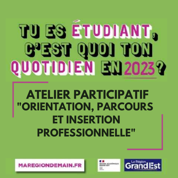 - Sur inscription (nombre de places limité) sur la plateforme « www.maregiondemain.fr », rubrique « Consultation Être étudiant en 2023 » – Sous-Rubrique « Ateliers participatifs ».