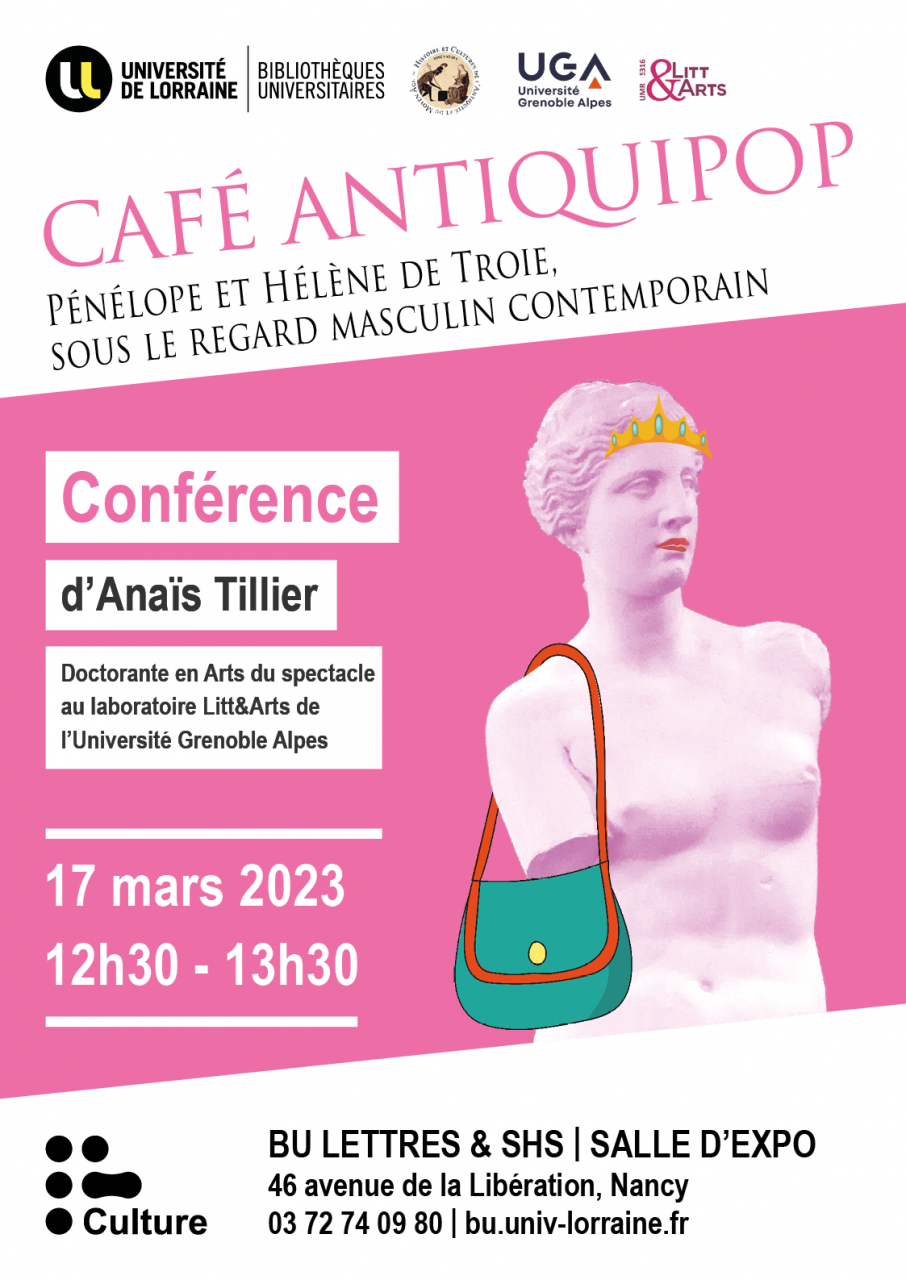 Anaïs Tillier, doctorante en Arts du spectacle au laboratoire Litt&Arts de l'Université Grenoble Alpes, animera la conférence Antiquipop, intitulée "Pénélope et Hélène de Troie, sous le regard masculin contemporain" dans la salle d’exposition de la bibliothèque universitaire de Lettres, Sciences humaines et sociales de Nancy, le 17 mars 2023 de 12h30 à 13h30.