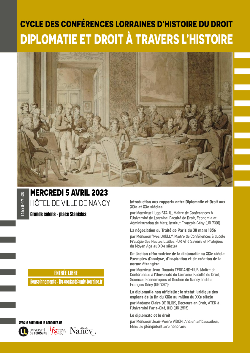 Dans le cadre du cycle des conférences lorraines d’Histoire du Droit, l'Institut François Gény vous propose une nouvelle conférence sur le thème "Diplomatie et droit à travers l'histoire".