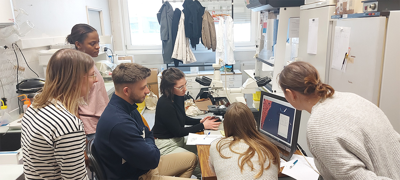 Consacré à la microscopie confocale, le 1er atelier s’est déroulé mardi 28 février sur la plateforme PTIBC (enseignant : Dominique Dumas, Ingénieur de Recherche) au cours duquel les étudiants ont été formé à la manipulation de microscopes confocaux pour caractériser des structures biologiques. Le lendemain, ils se sont rendus sur la plateforme d'histologie d'IMOPA pour apprendre à réaliser des lames histologiques (enseignante : Christel Henrionnet, Ingénieure de Recherche) et reconnaître au microscope les structures cutanées (épiderme, derme, kératinocytes, etc.) ainsi que les cancers cutanés. Grâce au dispositif d’imagerie par méthode LC-OCT de la plateforme PhotoVivo (enseignante : Marine Amouroux, Ingénieure de Recherche), les étudiants ont pu ensuite comprendre l’intérêt de la « biopsie optique » qui permet d’observer en temps réel, de manière non-invasive et en 3D les structures cutanées.