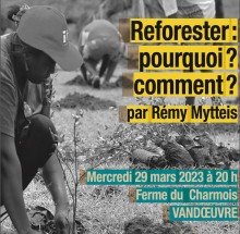 L'Université populaire et participative de Vandoeuvre (UP2V) organise le mercredi 29 mars, à 20 h, salle Michel-Dinet, ferme du Charmois à Vandoeuvre, une conférence intitulée : “Reforester, pourquoi, comment ?", animée par Rémy Mytteis.