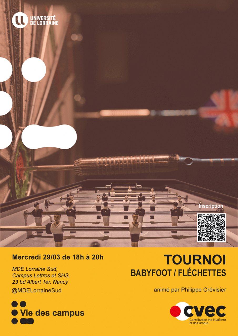 Viens t’affronter en équipe de deux durant ce tournoi qui allie le baby-foot et les fléchettes à la MDE Lorraine Sud sur le campus Lettres à Nancy.