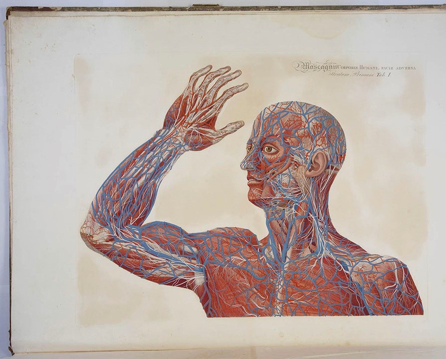 Ce travail est le résultat des recherches de Paolo Mascagni sur les vaisseaux sanguins. Il a été le premier à montrer la ramification des vaisseaux à travers la technique de l’injection de mercure. Chaque planche de l’atlas est en outre accompagnée d’une copie où sont indiquées en détail les parties anatomiques représentées. L’objectif pédagogique de l’œuvre était en effet l’une des préoccupations majeures de Mascagni qui enseignait l’anatomie à l’université de Pise, en Toscane.